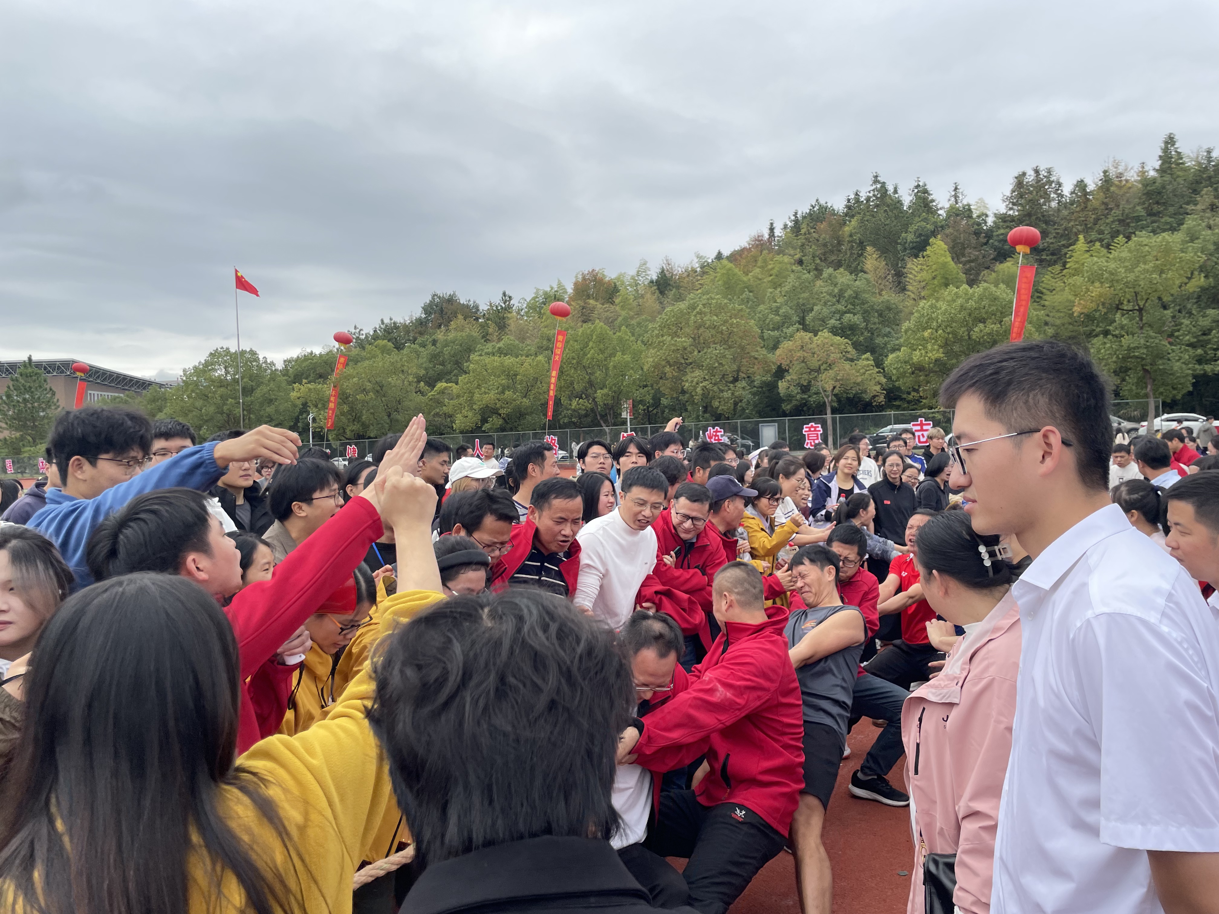 比赛现场气氛热烈,呐喊声与助威声此起彼伏。我院教工队员们赛前精心部署战术,上场迅速进入状态。随着裁判哨声响起,队员们齐声高呼“一二!拉!”,手臂青筋凸起间,将全身力量凝聚于一根长绳之上。面对强劲对手的反扑,蓝绳在中线反复拉锯,队员们咬紧牙关、寸步不让,用坚持诠释着“心往一处想、劲往一处使”的协作精神。